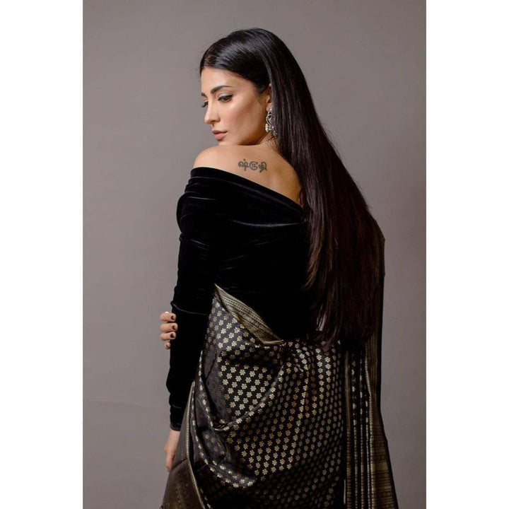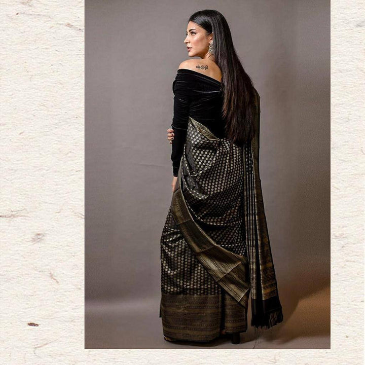 Stylish Black Colour Banarasi Litchi Silk Saree With Blouse Piece