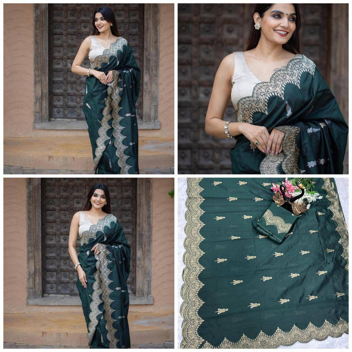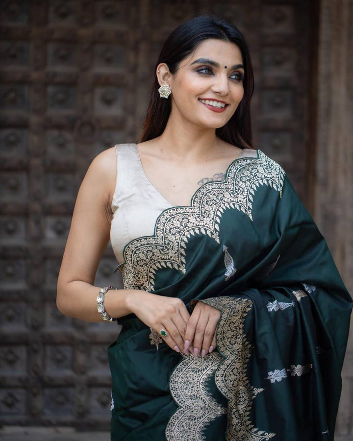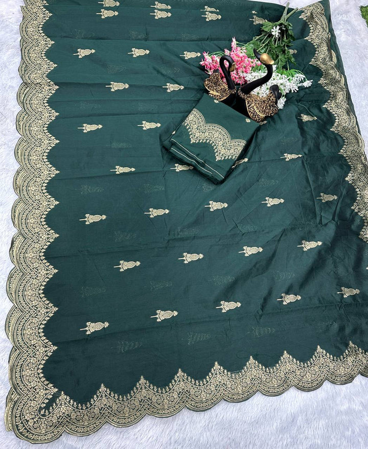 Bottle Green Colour Banarasi Litchi Silk Saree With Blouse Piece