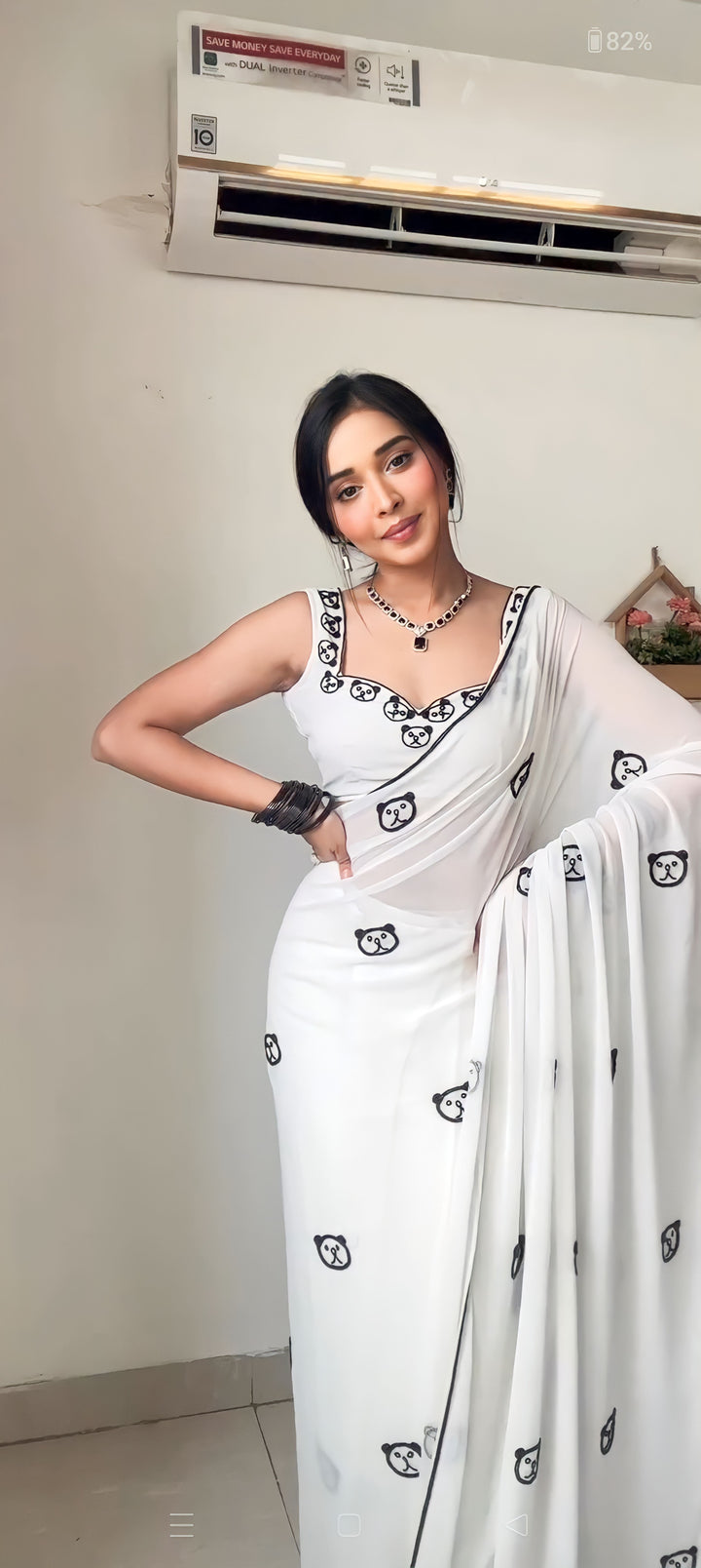 Looking for an effortless blend of tradition and style? Look no further because our Ready To Wear White Georgette Saree is all you need. This incredibly beautiful saree is pre-stitched and pre-pleated, allowing you to wear it within minutes. The pristine white color, combined with the soft texture of Georgette, creates a mesmerizing aesthetic that suits any occasion. It's the perfect example of simplicity meeting elegance.