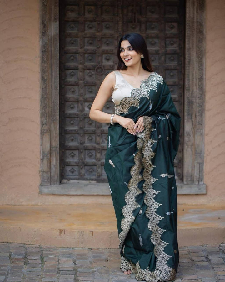 This kanjivaram has body in green colour is adorned with alluring golden zari cycle zooming motifs on body. pallu joined with paithani joint is ornamented with intricate zari works. This drape in exclusive colour combination will be a must have addition to your saree collection.
