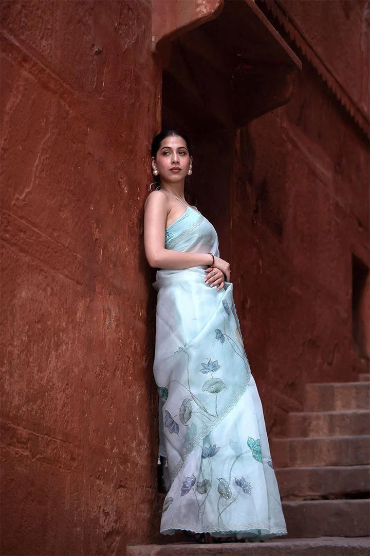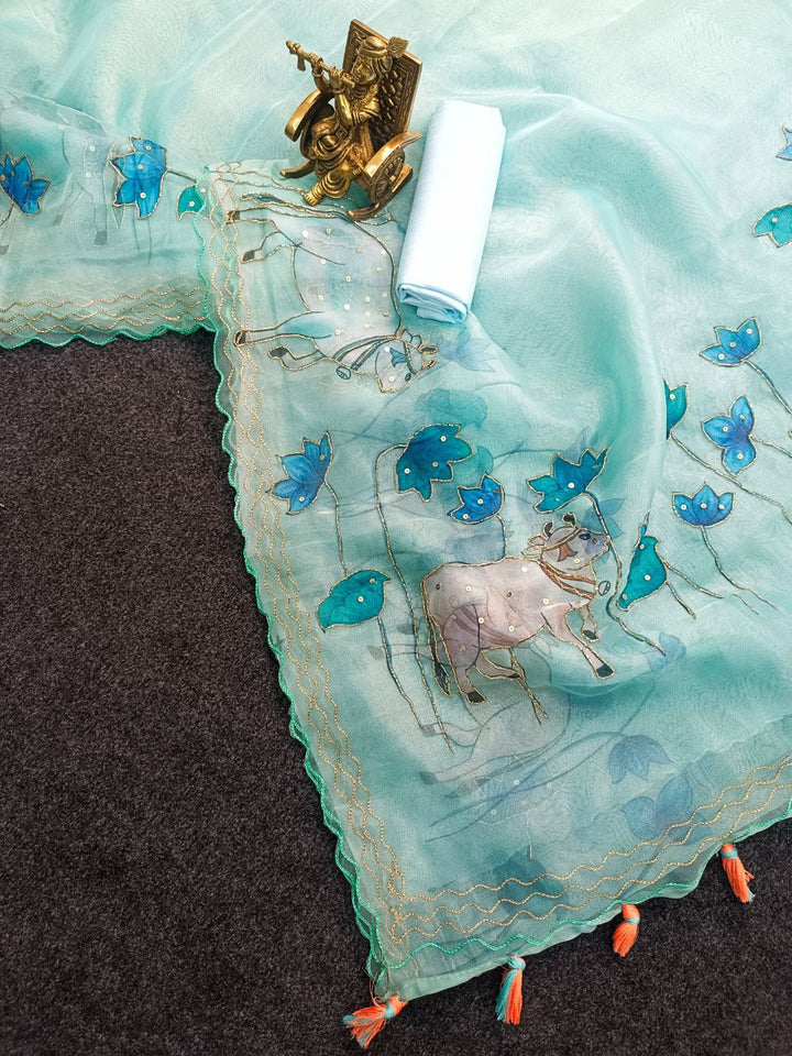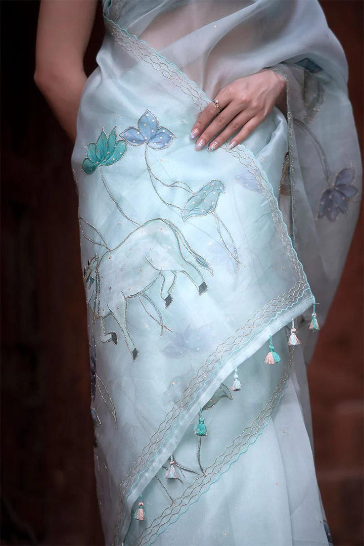 Light Blue Pichwai Embellished Organza Silk Saree