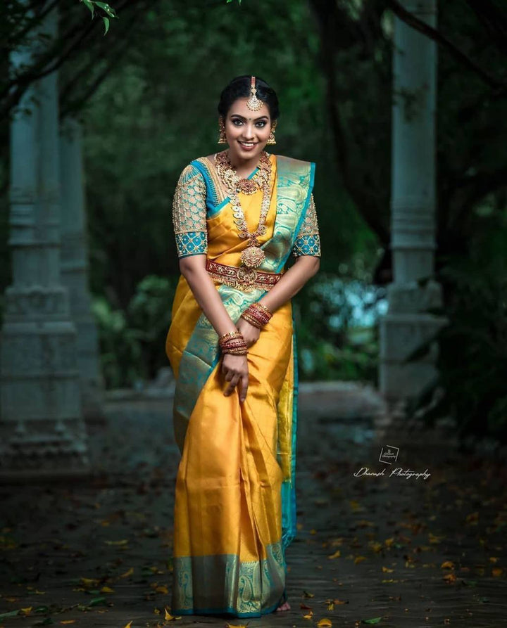 Yellow and Rama Colour Kanjivaram Woven Silk Saree With Blouse Piece