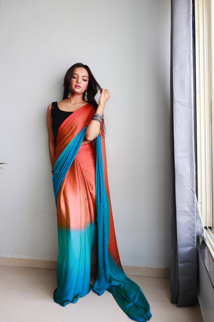 Mesmerising 1-Minute Ready To Wear Orange and Firozi Chiffon Silk Saree