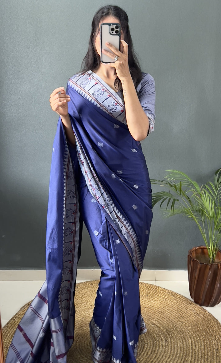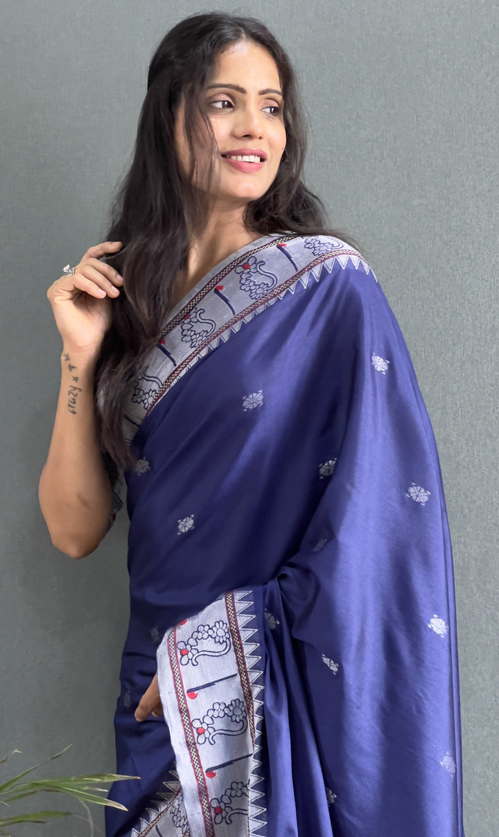 Navy Blue Color Pure Paithani Silk Saree With Muniya Boder And Silver Zari Weaving Work Saree