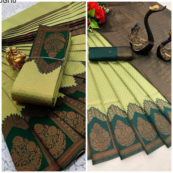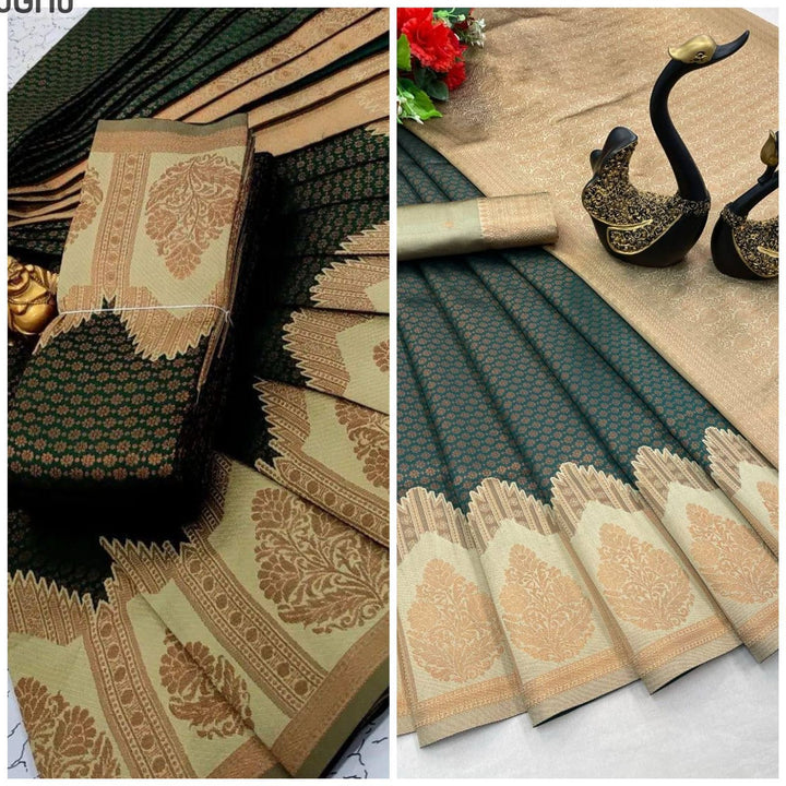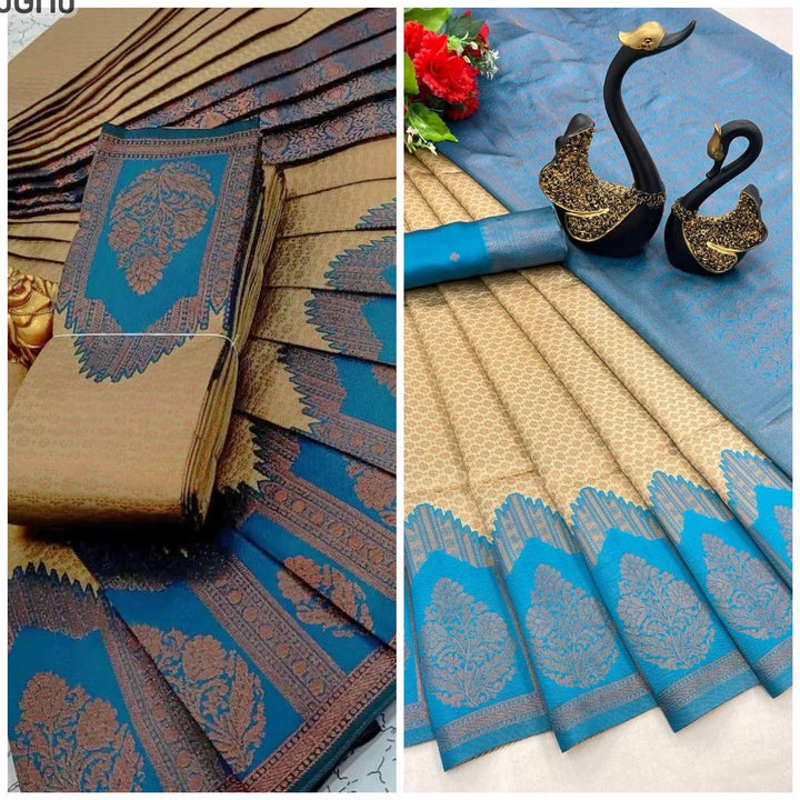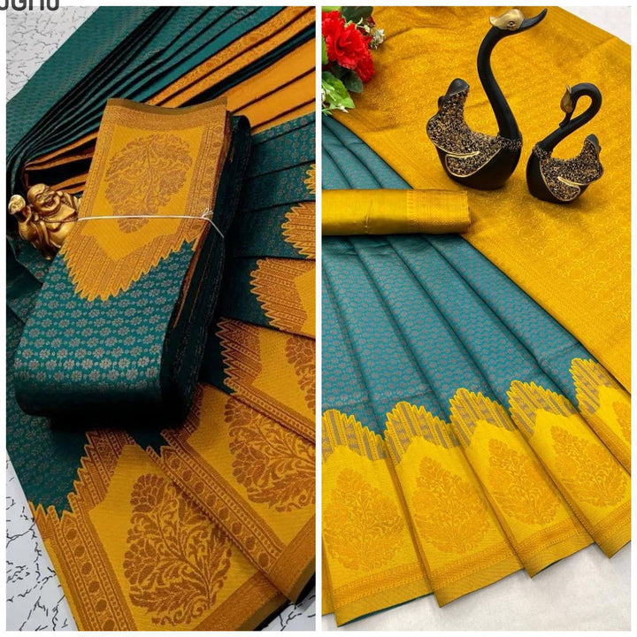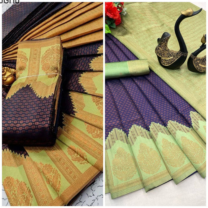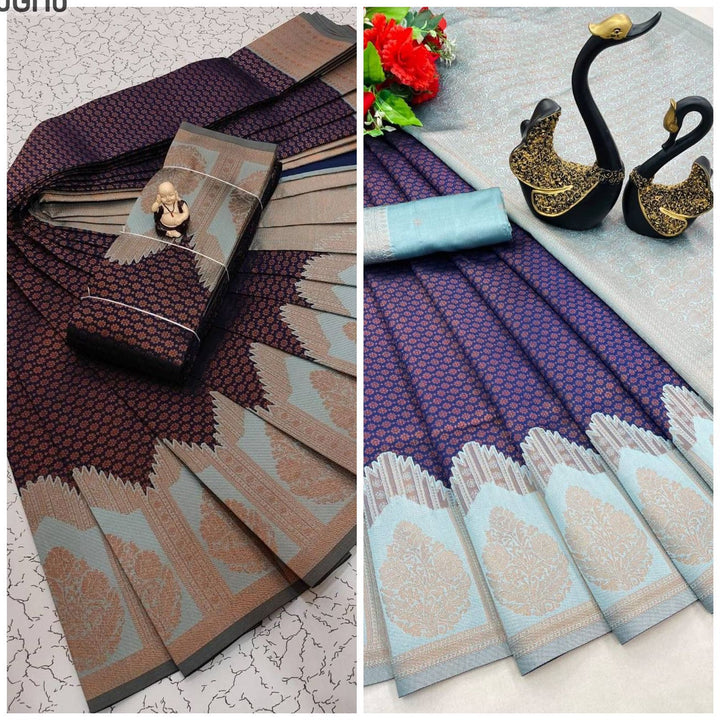 Most Stunning Triple Weaving Zari Concept Tissue Sarees . This concept Sarees is best for Party and wedding Occasion.This Tissue Kanchi Sarees is made of Pure Copper Zari and Self Design with contrast Colour Meena makes Sarees Adorable