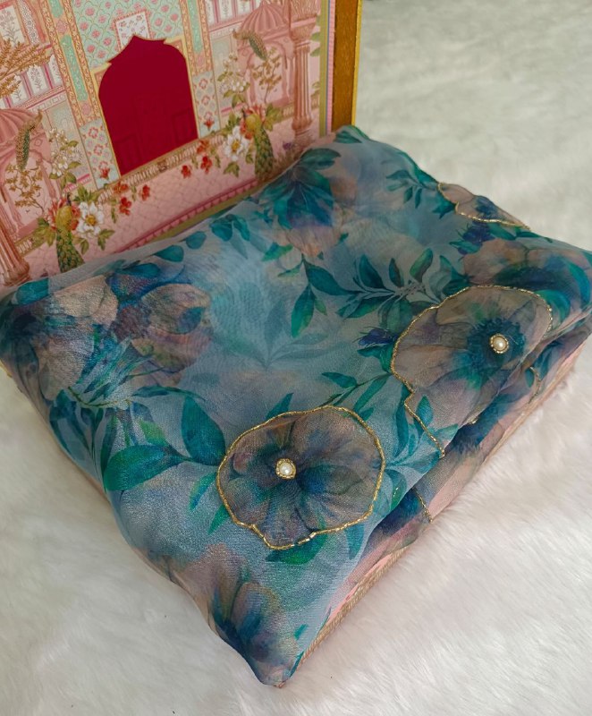 It has all over digital print with handwork (Khatli) work digital printed saree.