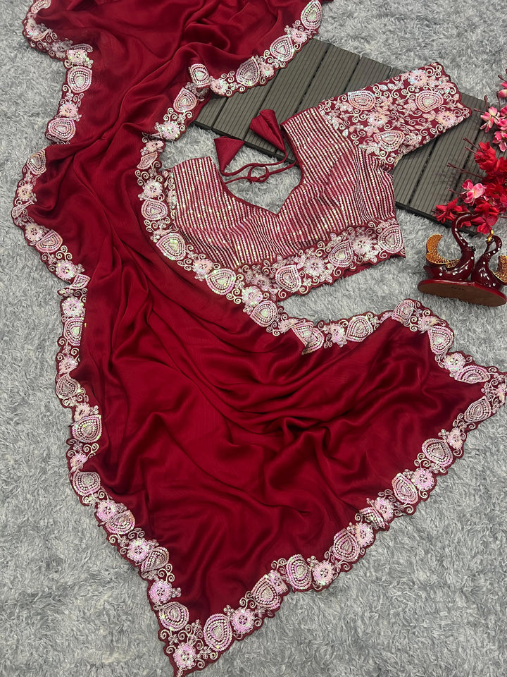 Red Beautiful Sequins Saree With Embroidery Work
