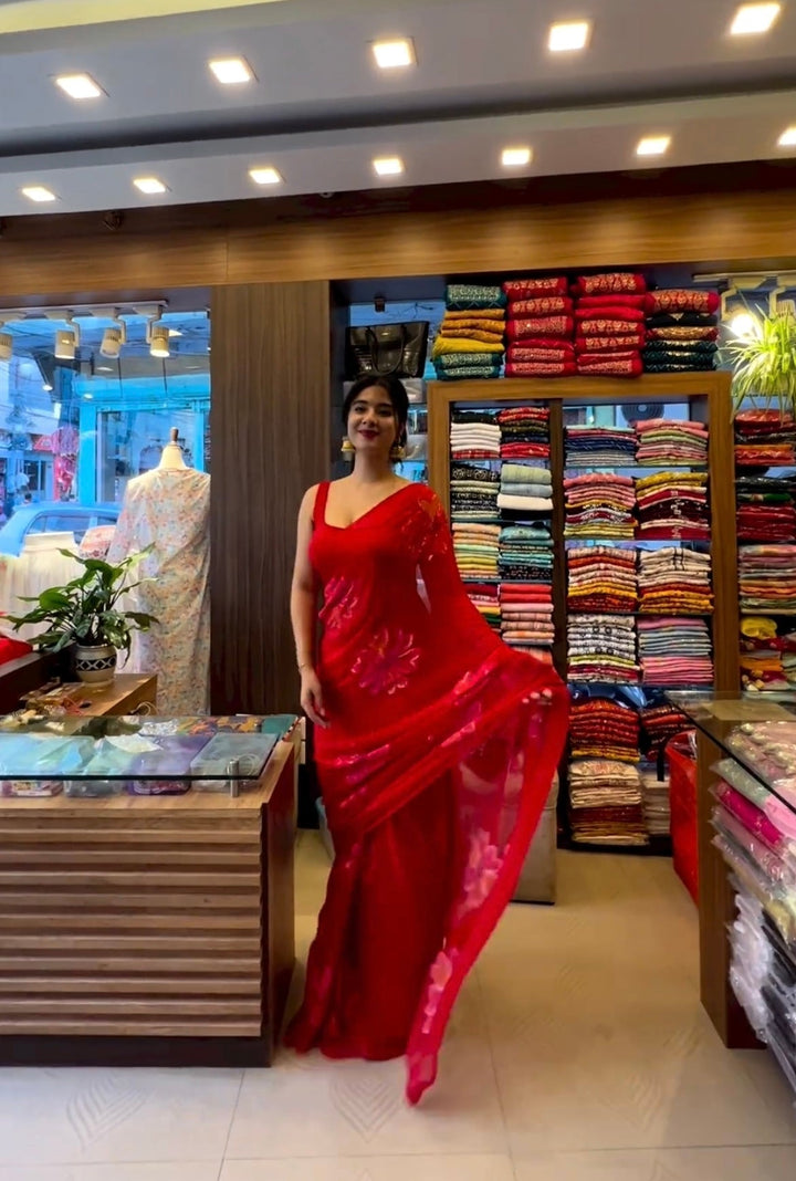🌺 Flaunt a stellar ensemble at your intimate occasions with our Premium Soft Georgette Saree, adorned with a beautiful flower and leaf print and exquisite hand sequence work. The luxurious Banglori Silk blouse adds an extra touch of elegance, making this saree a perfect blend of culture and contemporary charm. Choose this piece and take home a proud story of tradition and modern allure.