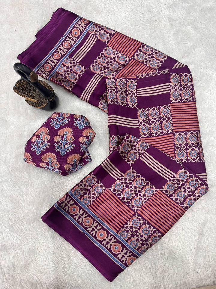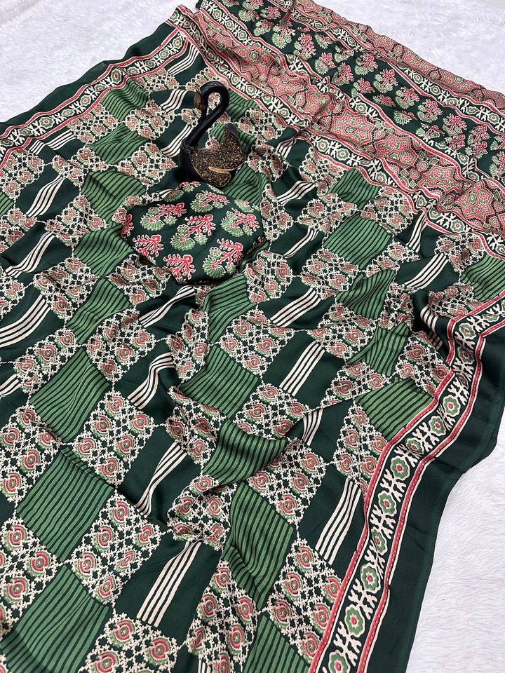 Elevate your wardrobe with the exquisite beauty of our Ajrakh Printed Gajji Soft Silk Saree. Crafted from the finest quality silk, this saree features intricate Ajrakh printing, showcasing a timeless and elegant design. Wrap yourself in luxury and sophistication with this statement piece that is sure to turn heads.