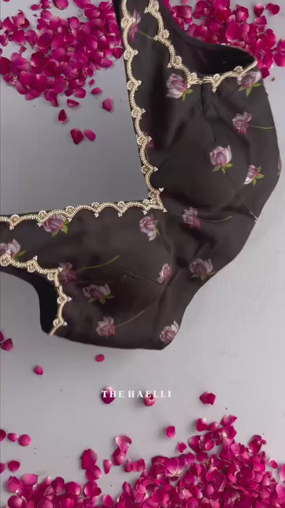 Step into elegance with our Soft Tebby Organza Silk Saree, featuring beautiful floral prints that exude charm and grace. The saree is enhanced with a handworked Khatli border, delicately adorned with Cut Dana touch-ups and elegant Aarco detailing, giving it a luxurious designer finish.